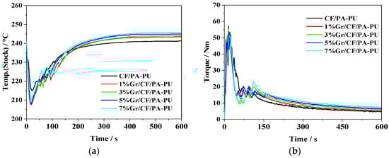 (a) Temperature–time and (b) torque–time curves of CF/PA-PU composites with different contents of Gr.