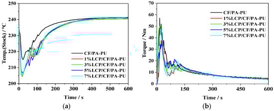 (a) Temperature–time and (b) torque–time curves of CF/PA-PU composites with different contents of LCP.