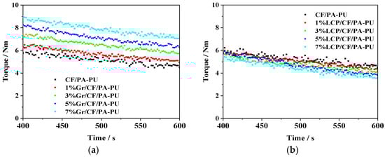 Torque–time curve (400–600 s) of CF/PA-PU composites with different contents of (a) Gr and (b) LCP respectively.
