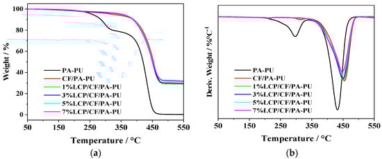 (a) TG and (b) DTG curves of CF/PA-PU composites with different contents of LCP.