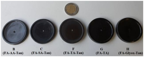 The curing tests of the impregnating solutions at 103 °C for 24 h during preliminary testing demonstrated that almost all formulated solutions polymerized completely, creating a black colored solid polymer (Figure 1). However, due to the lower reactivity of adipic acid (AA) and succinic acid (SA) when compared to tartaric acid (TA), the system that contained only FA-AA (D) or FA-SA (E) did not lead to a solid polymeric material at the given curing temperature. These results were in agreement with previous research works on the characteristics of some catalysts during FA polymerization; these studies reported that SA (K1 6.5 × 10−5) or AA (K1 3.72 × 10−5) have lower dissociation constants than TA (K1 9.6 × 10−4) [13], hence providing lower reactivity towards polymerization of FA. On the other hand, a partial substitution of FA by the tannins into solutions D and E in order to become solution B and C improved reactivity of the polymerization reaction, indicating there was a synergistic effect due to this tannin addition, since a solution of FA without the addition of tannins did not polymerize without the addition of acid (SA or AA, in this case) or vice versa.