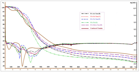 TG (top) and DTG (bottom) of different furanic or tannin-furfuryl alcohol polymers and condensed tannins.