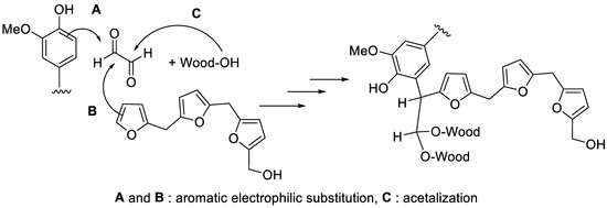 Other reactions involving esterification reactions of hydroxyl groups of wood components or tannins with different carboxylic acids used as catalysts could also be involved in the polymerization reaction at high temperatures.