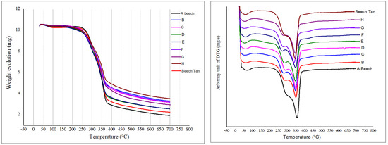 Further degradation occurred between 275 and ~310 °C (depending on the impregnated polymer), corresponding mostly to the degradation of some wood components and part of the impregnated polymer (Figure 2). Similar to the untreated wood, the highest mass loss rate occurred between ~375 and 492 °C, whereby both the wood components and the impregnated polymers decreased considerably due to thermal degradation of the remaining polymer and carbonization. Since the thermal stability of the impregnated furanic or tannin-furfuryl alcohol polymer was higher than that of the untreated wood, all modified woods, according to their obtained average WPG, demonstrated greater thermal stability than the untreated woods (Table 4). As previously explained, the addition of tannins, which have high thermal stability due to their aromatic structures, contributes to the higher thermal stability of the tannin-furfuryl alcohol modified wood when compared to the untreated wood. For the impregnated furanic polymer, the effect of the wood component modification (e.g., modification of lignin) was the main reason for the thermal stability improvement of the modified wood when compared to the untreated wood.