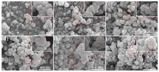 Figure 1a–d show the microscopic morphology of the N-series carbon blacks. It can be seen that the carbon black particle size gradually increases with the model, with N330a having the smallest particle size and N660a having the largest particle size, which is consistent with the relevant reports from the conventional industry [37,38]. Figure 1e,f then display the microscopic morphology of carbon black after the first and second thermal cracking recovery of N330. Although N330b and N330c have similar morphology to N330a (pure sample), the boundary between the particles of N330a is obvious. In contrast, N330b and N330c show a rare agglomeration phenomenon, sticking to each other with a significantly higher confusion than N330a, which may be because the rubber composites were subjected to thermal decomposition and the combined effect of residual tar and bound rubber [3,39]. This phenomenon also occurred in the corresponding thermally cracked recovered carbon blacks of N115a, N550a, and N660a (Figure S1). Figure S2b presents the SEM view of NR/N330a. NR/N330a is not smooth because ZnO and CB nanoparticles are attached to the surface of NR/N330a. The elemental profiles demonstrate that C, O, Zn, and S are uniformly represented in NR/N330a. In addition, the SEM–EDS mapping of NR/N115a, NR/N550a, and NR/N660a display similar SEM–EDS mapping results, as shown in Figure S2.