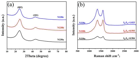 (a) XRD patterns and (b) Raman spectrums of N330a, N330b, N330c.