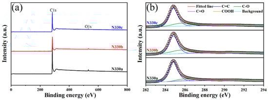 (a) XPS full spectra and (b) C1s spectra of N330a, N330b, N330c.