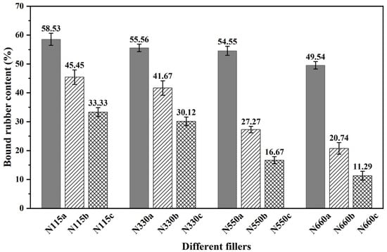 The bound rubber content is strong evidence of the filler’s effect on rubber reinforcement [3]. As shown in Figure 4, the measured binding gel content of rubber composites filled with N115a, N330a, N550a, and N660a and their primary and secondary thermal cracking recovered carbon black is demonstrated. It can be seen that for the rubber composites with pure samples N115a, N330a, N550a, and N660a added, the bonded rubber content gradually decreases from 58.53% at the beginning for NR/N115a to 49.54% for NR/N660a. This indicates that the smaller the particle size of carbon black, the more bonded rubber content is formed. In addition, taking NR/N330a, NR/N330b, and NR/N330c as examples, N330a also showed a gradual decrease in the binding gel content after primary and secondary thermal cracking recovery, which may be related to the decrease in the number and type of functional groups on the carbon black surface [45,46]. This is also consistent with the results of the previous XPS analysis.