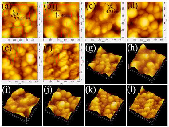 AFM micrographs of (a) NR/N115a, (b) NR/N330a, (c) NR/N550a, (d) NR/N-660a, (e) NR/N115b, (f) NR/N330b; and the 3D maps of (g) NR/N115a, (h) NR/N330a, (i) NR/N550a, (j) NR/N-660a, (k) NR/N115b, (l) NR/N330b.