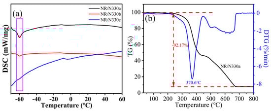 (a) DSC curves of NR/N330, and (b) TG–DTG curves of NR/N330a.