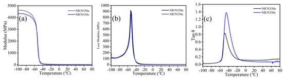 Figure 7b shows the loss modulus versus temperature curve of NR/N330. As is well known, a higher E′′ means a larger viscosity deformation and bigger contact area, thereby enhancing the driving safety of vehicles [17,53,54]. The E′ values of NR/N330c and NR/N330a tend to be consistent. The E′′ of NR/N115, NR/N550, and NR/N660 also showed similar E′′ curve trends, as shown in Figure S10.