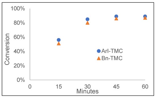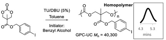 Following the synthesis of the ArI-TMC monomer, homopolymerization of the monomer was attempted in toluene. A classic organic co-catalyst combination, the H-bonding N′-[3,5-Bis(trifluoromethyl)phenyl]-N-cyclohexylthiourea (TU), and the strong base 1,8-Diazabicyclo[5.4.0]undec-7-ene (DBU) were selected because of their good speed and control of the polymerization reaction []. When using benzyl alcohol as an initiator, the homopolymerization of ArI-TMC in toluene with the organic co-catalysts DBU and TU was successful, with high conversion to the polymer within a couple of hours (Figure 4). The percent conversion was determined to be greater than 95% using 1H NMR spectroscopy. The polymer was purified by dialysis, yielding a clean product.