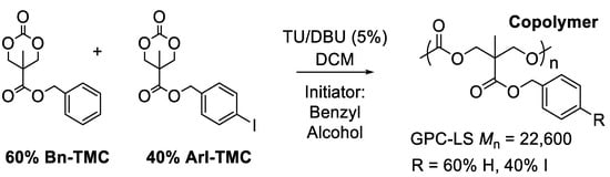 The successful homopolymerization demonstrated that the ArI-TMC monomer could be efficiently polymerized with the TU/DBU catalyst system. With this knowledge, we turned our attention to preparing a copolymer composed of ArI-TMC and Bn-TMC, as we deemed it would be prudent to space out the iodoaryl groups due to the disproportionation reaction of iodosylarene units becoming kinetically significant at higher concentrations (Figure 5) []. We reasoned that spacing out the iodoaryl groups in the copolymer could slow down disproportionation once the iodoaryl groups were oxidized to iodosylaryl groups, the targeted oxygen atom transfer (OAT) reagent. Accordingly, a random copolymer was synthesized with 60 mole percent Bn-TMC and 40 mole percent ArI-TMC, using the TU/DBU cocatalyst combination with benzyl alcohol initiator and dichloromethane (DCM) as the reaction solvent (Figure 6). DCM dissolved the two different monomers more efficiently than toluene, so that both monomers fully dissolved after several minutes of stirring. The initiator was then added to the homogeneous solution to start the polymerization reaction, and the reaction was run for four hours. The product was purified by dialysis. For molecular weight determination of the homopolymer, we opted to employ gel permeation chromatography with a multi-angle light scattering detector (GPC-LS), as GPC-LS is considered the most accurate method for the absolute determination of the molecular weight []. The GPC-LS spectrum showed a single polymer peak near the expected molecular weight (expected Mn = 30,200, actual Mn = 22,600). The copolymer also had a low dispersity, Đ = 1.19. Additionally, the product was characterized by 1H and 13C NMR spectroscopy.