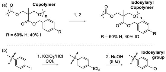 Oxidation of the iodoaryl groups to iodosylaryl groups in the copolymer. (a) Overall oxidation of the copolymer. (b) Reaction sequence occurring at the iodoaryl groups.