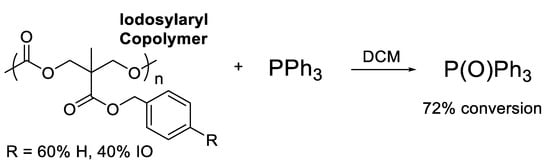 The iodosyl copolymer was tested in an OAT reaction to give a preliminary judgment of its efficacy. The iodosyl copolymer was dissolved in deuterated chloroform and reacted at room temperature with 0.5 equivalents of triphenylphosphine relative to the iodosyl loading of the copolymer (Figure 10). The percent conversion to triphenylphosphine oxide was determined to be 72% by 31P NMR spectroscopy. The product was identified by comparison with the 31P NMR spectrum of a known sample of triphenylphosphine oxide. The oxidizing ability of the iodosyl copolymer was found to be much better than poly(4-vinylpyridine-N-oxide), which typically oxidized phosphines and phosphates to their respective oxides with less than 20% conversion, even with prolonged heating at 110 °C []. The result with the iodosyl copolymer demonstrated a clear improvement over previous work in our group and showed promise that the iodosyl copolymer could be useful in oxygen atom transfer reactions.