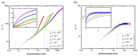 The time-varying elongational viscosities () for linear polymers with (a) and N = 10 (b) subject to various strain rates (). For the purpose of comparison, the elongational viscosity is non-dimensionalized by the shear viscosity of monomers. In the inset, the transient elongational viscosity is plotted against the Hencky strain ().