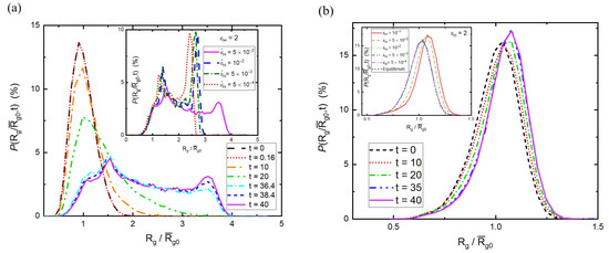The time evolution of the distribution of under stretching for (a) and N = 10 (b) at the strain rate . The inset demonstrates the effect of the strain rate on the size distribution at .