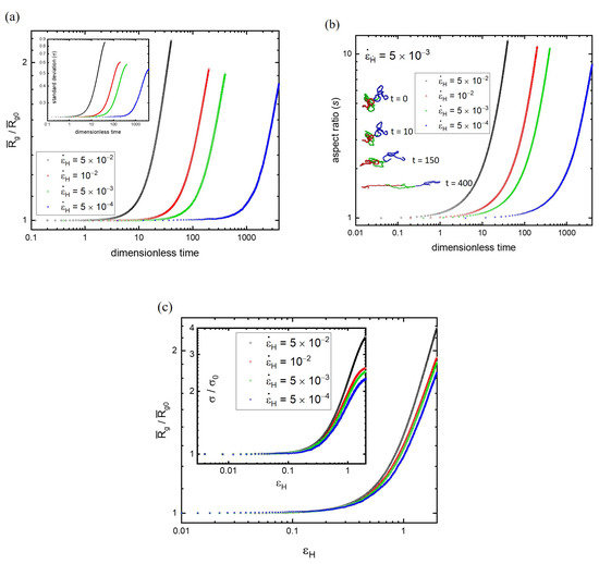 (a) The variation of with time at various strain rates for , where is the mean radius of gyration. In the inset, the standard deviation () of is plotted against time. (b) The variation of the aspect ratio (s) with time at different for . The representative polymer conformations at different times are shown in the inset at . (c) The variation of the mean radius of gyration with the elongation deformation ( vs. ) for N = 130 at different . For comparison, the plot of the standard deviation against is depicted in the inset.