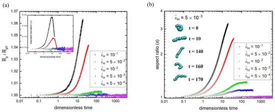 The onset of strain hardening is generally identified as the point at which the elongational viscosity deviates from the linear viscoelastic response. However, is difficult to acquire accurately because the strain rate needs to be as small as possible. At , the thermal noise causes significant fluctuations of stress and [25], as illustrated in Figure 1. It is desirable to understand the change in the microstructure of polymers near the onset point of strain hardening. Instead of the radial size distribution, the mean radius of gyration of polymers is easier to use for the monitoring of the microstructural evolution during stretching. Figure 3a shows the variation of with time at various strain rates for . It is found that, regardless of , all curves of remain at unity for a while and then upturn rapidly at some points. The turning point occurs earlier when the strain rate is higher. The comparison of the onset points between Figure 1a and Figure 3a indicates that they coincided with each other for a given strain rate. This reveals that the upturn of the elongational viscosity is actually accompanied by the drastic change in the microstructure of the polymer melt. That is, strain hardening takes place as the average radial size of polymers starts to grow from the equilibrium state. Although the stretching process stops at for all strain rates, the radial size of polymers is larger for higher . To maintain a higher , higher stress is required, which causes larger polymer deformation.