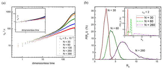 (a) The growth of with time at for various chain lengths (). In the inset, is considered as well. The filled and hollow symbols represent and , respectively. (b) The radial size distributions at for at . The black solid line represents the size distribution at equilibrium. The radial size distributions at are demonstrated in the inset.