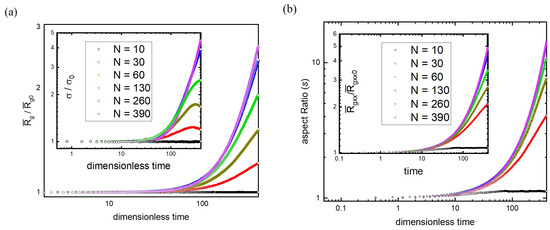 (a) The microscopic evolution of polymer conformations in terms of at for various molecular weights. The inset illustrates the variation of over time, where is the standard deviation of P() at the equilibrium state. (b) The variation of the aspect ratio with time at for different molecular weights. For comparison, the plot of the radius of gyration along the stretching direction (/) against time is depicted in the inset.