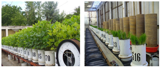 The agrochemical experimentations were carried out in the vegetation room belonging to the National Research and Development Institute for Pedology—ICPA Bucharest. The seeds of green pea, sunflower, corn and soybean were sowed during the springtime (end of March) in plastic vegetation pots containing 1 kg of the tested soils sampled from Greece (two types of poor soils with very low nutrient contents characterized according to the data shown in Section 3.1). Both soils (S1-and S3-SiCL) were pretreated (amended) with 5% agro-hydrogels (Ref-CH, POLY and STAR) 4 months before the cultivation for a good homogenization of the agro-hydrogels added with soil and for adaptability of the existing microorganisms in the soils. The soil humidity in the vegetation pots was ensured at a permanent 70% level of the field capacity. According to the testing methodology, three replicates (three plants per single replication for the beginning and one month after rising and growth) were ensured for each experimental variant. The experiment was finished in September.