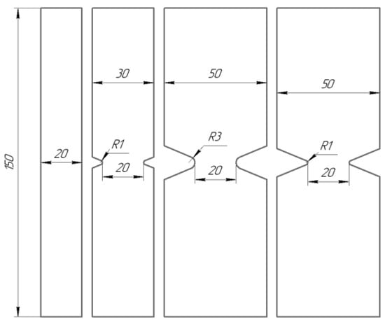 Notch geometries were chosen to consider variations in the notch length and radius. This is necessary for the further checking of forecast methods to exclude the geometry influence of various stress-raisers on the result. Further in the article, the following naming system for specimens is adopted: Not. sp. 15 × 3, Not. sp. 15 × 1 Not. sp. 5 × 1.