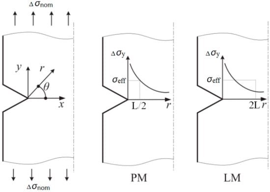 The TCD method is essentially a linear elastic fracture mechanics (LEFM) approach, and, as such, is based on the elastic stress analysis of the notch or feature in question. The stress at a characteristic point or the average stress over a characteristic line in the vicinity of the notch is considered. Failure is predicted to occur when the stress range at the point (or averaged over the line) is equal to the stress needed to cause failure in a plain specimen at the same number of cycles. According to the topology type, TCD can be divided into the following categories, as shown in Figure 3.