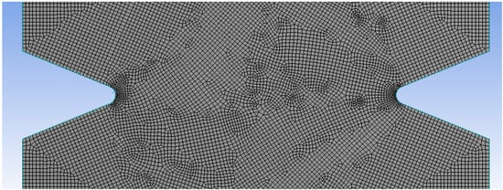 In order to determine the stress–distance curve, 2D finite element (FE) models were made using the commercial software ANSYS (Ansys workbench 2019 R3). The specimens were designed as a single solid structure. Mesh parameters included 119,196 elements and 515,994 nodes. Plain 145 finite elements with 8 nodes and quadratic approximation were used. Figure 4 shows an example of an FE mesh used to model the notched specimens. By doing so, a refined mesh of about 0.025 mm element size in the critical region of the notch tip was applied. The size of the finite elements was selected in such a way that at least 5 finite elements were located within the critical distance [55]. These were sufficient to give accurate stress–distance information in the critical regions.