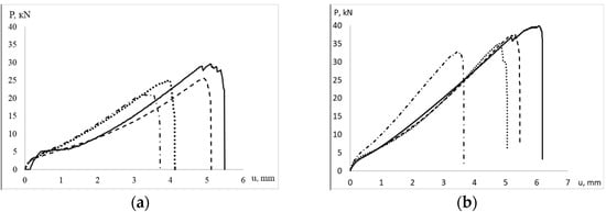 For each type of specimen, quasi-static tensile tests were carried out to obtain the ultimate load values. Loading diagrams are shown in Figure 5. The data are shown in Table 2.