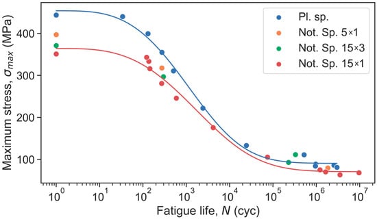 The results of the fatigue test were expressed in terms of the maximum stress versus fatigue life diagram, as shown in Figure 6. Additionally, this diagram displays the results of the tensile tests as maximum stress at one load cycle that corresponds to the ultimate tensile strength. Overall, the experimental results show that the maximum stress values the notched specimens can withstand are less than those of the plain specimens. The Weibull fitting parameters were obtained only for two types of specimen: plain and 15 × 1 notched (Table 3). As one may see from Table 3, α and β values for plain and 15 × 1 notched specimens do not change significantly. This means that the only difference is related to σu and σ∞ values. In this case, the ultimate tensile strength values may be considered the fatigue strength at one cycle while the fatigue limit values are obtained at an infinite number of cycles.
