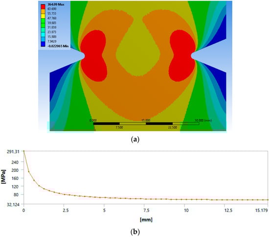 A numerical study of all the used specimen geometries was conducted. Figure 7 illustrates, as an example, the FEM output for the 15 × 1 notched specimen. Thus, utilizing the linearized maximum principal stress as a stress–distance curve, as well as σu and σ∞ values from Table 3, the critical distances were calculated at one and an infinite number of cycles: