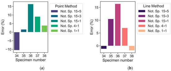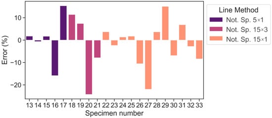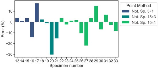 On account of the error values (%), Figure 8 and Figure 9 illustrates the advantage of LM over PM in terms of maximum values. The maximum error is within ±30.4% for PM and ±24.3% for LM (warp direction). By doing so, the average absolute errors are equal to 8.4% and 8.2% for PM and LM, respectively. In the case of the weft direction (Figure 10), the maximum error values are within ±16.4% and the average absolute errors are equal to 8.3% and 7.4% for PM and LM, respectively. A maximum average absolute error of 12.8% was obtained using the LM method. Maximum errors of the selected data points exceeded 20% only for the 20th (15 × 3) and 27th (15 × 1) notched specimens. Overall, LM is preferable to PM in this scenario.