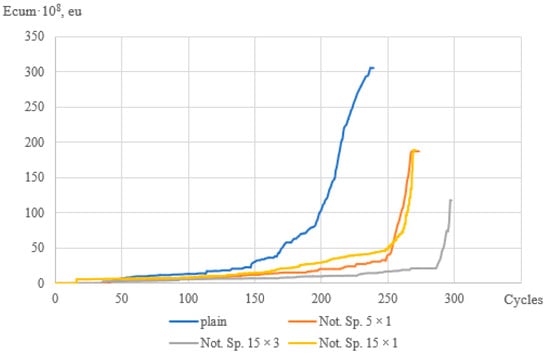 Diagrams of the dependence of the cumulative energy of AE signals on the number of cycles to failure of fiberglass specimens of various geometries are shown in Figure 11. For specimens at a load level of k = 0.8, different values of the cumulative energy could be noted depending on the geometry of the specimens. For the specimens without the stress concentration, the level of the cumulative energy is 1.5–2 times higher than for the specimens with the stress concentration. For the specimens with the stress concentration, a sharp increase is observed at 92–96% of the completed cycle, while for the specimens without the stress concentration, this value is lower by 10–15%, and the graph looks smoother. This may indicate that the accumulation of damage in the specimens with different geometries occurs differently with an approximately equal number of cycles and equal load.