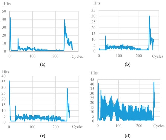 Diagram of the number of signals vs. the number of cycles (k = 0.8): (a) plain, (b) not. Sp. 5 × 1, (c) not. Sp. 15 × 3, (d) not. Sp. 15 × 1.