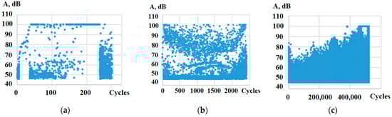 The amplitude-to-cycle ratio diagrams (Figure 13) show that, with a small number of cycles, the amplitude of the AE signals reached a maximum as early as the start of the test (Figure 13a,b), and high values of the amplitude were retained until specimen failure. The process of damage accumulation has a more staged nature, with an increase in the number of cycles; the amplitude reaches peak values before destruction. The material in this case “adjusts” to small loads, k = 0.25 (Figure 13c). However, the value of the peak amplitudes was recorded above 75 dB in all the tests, which indicates similar failure processes in the material [56].