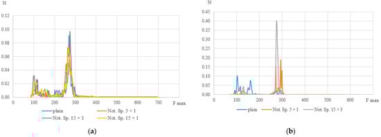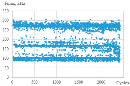 A typical plot of the dependence of the peak frequencies on the number of signals is shown in Figure 14. Three frequency ranges are shown: from 100 to 140 kHz, from 160 to 200 kHz, and from 220 to 320 kHz. The authors believe that these ranges characterize failure mechanisms such as matrix cracking, delamination, and fiber rupture, respectively [57]. In this representation, peak frequencies are present for specimens with different geometries in all three ranges. This emphasizes the need to analyze the histograms of the distribution of the peak frequencies from the number of signals.
