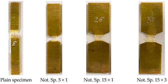 The model layered polymer composite STEF (ST—fiberglass; EF—epoxy-phenol-formaldehyde or epoxy binder) was studied in this work. This is the laminated reinforced fiberglass obtained by hot-pressing of the fiberglass cloth impregnated with a thermoreactive compound based on combined epoxide and phenol-formaldehyde resins. Specimens without concentrators (in the form of strips) and specimens with a concentrator in the form of a V-shaped cut in the working part were made from a GFRP sheet 5 mm thick. Specimens of each geometry were cut in the warp and weft directions. Figure 1 shows the specimens. As specimens with stress concentrators, four varieties with different geometries were used: the depth of the notch and the radius of the apex of the notch was 15 mm and 3 mm (R3); 15 mm and 1 mm (R1), 5 mm and 1 mm (R1), respectively. In the article, the following naming system for specimens is adopted: Not. sp. 15 × 3, Not. sp. 15 × 1 Not. sp. 5 × 1.