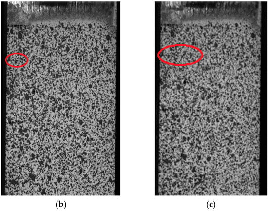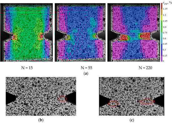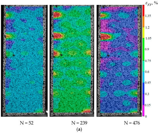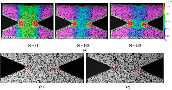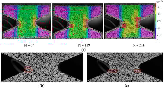 To identify the fracture mechanism of specimens using a three-dimensional optical system Vic-3D, the evolution of longitudinal strain fields is constructed. With the help of the correlation analysis, it was possible to fix the beginning of the localization corresponding to a certain point in time and a certain cycle. For the specimens with V-shaped notches in the central part, the moment of crack-growing is recorded at the notch tip. For deformation patterns obtained using the Vic-3D software, images of the working area at the moment of loading the specimens are illustrated as an example. These pictures correspond to the crack growth start (the red circle marks the cracks) and the last photograph in the evolution of inhomogeneous longitudinal deformation fields, the time point, and the cycle (see Figure 17b,c, Figure 18b,c, Figure 19b,c and Figure 20b,c).