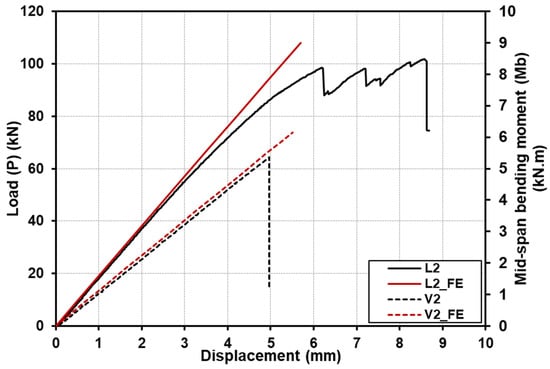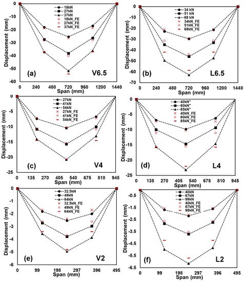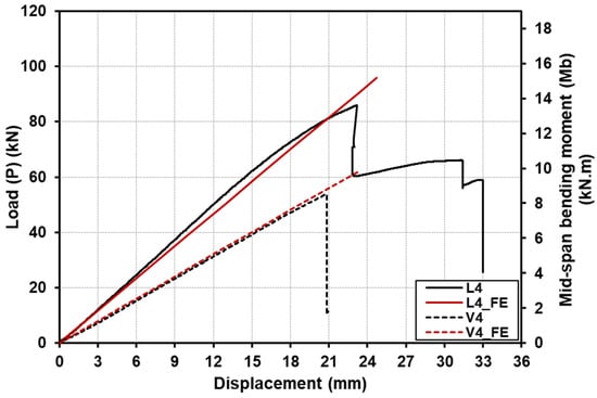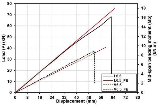 - All tested GFRP-softwood sandwich specimens, with the core configurations of either longitudinal or vertical timber fibre direction, exhibited similar load–deflection behaviours, which were approximately linear until the first failure occurred. The increase in moment capacity was similar for the specimens with a shear-span-to-depth ratio a/d of 4 (L4 and V4) by around 60% in comparison to L2 and V2 (a/d of 2). However, there was a different improvement in moment capacity for L6.5 (95%) and V6.5 (68%) in comparison to L2 and V2, respectively.