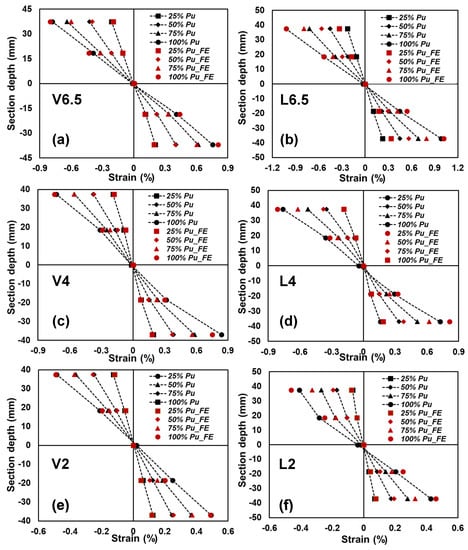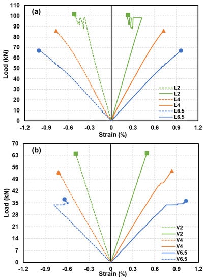 | Specimens | % Strain at Mid-Span Top | % Strain at Mid-Span Bottom | % Strain at Shear-Span | ||||||