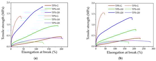 The obtained results are compiled in Figure 1 and Table 2. Figure 1 shows the extruded films’ longitudinal and transverse tensile strength vs. elongation at break. The curves in Figure 1 were built with the average of the data collected for each treatment to show the tendency of the mechanical behavior of the material. Previously, the films were aged at different periods according to the experimental section. Here, it is observed that as the amount of isosorbide in the film formulation increases, the stress increases and the strain decreases. The use of isosorbide caused an increase in the elastic modulus (E). The E value was twice higher in the case of TPSi-10 and up to four times higher for TPS-i20 films. The same behavior was observed for the tensile strength (σ) values.