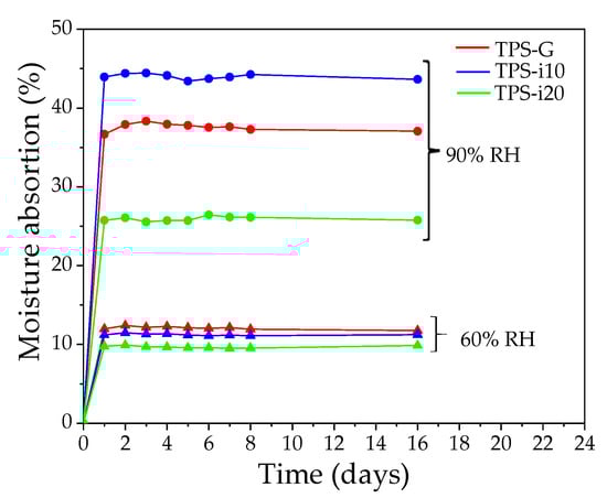 Figure 2 shows the behavior of TPS-G, TPS-i10, and TPS-i20 in moisture absorption versus time plots. The water-absorption capacity of TPS films co-plasticized with different glycerol/isosorbide ratios stored in environments with two relative humidities (60 and 90% RH) was evaluated. The amount of moisture absorbed varied according to the RH of the environment and the co-plasticization system. The TPS samples showed rapid absorption in the first 24 h of storage. Subsequently, the water absorption rate decreased notably, remaining relatively stable until the last day of measurement. This behavior is in agreement with other results reported by other authors [36,37]. At 60% RH, moisture absorption ranged from 9 to 12% and was much lower than at 90% RH. Although the difference in the amount of water absorbed at 60% RH was minimal, it is observed to decrease with an increasing amount of isosorbide. In the 90% RH environment, the amount of water absorbed by the films increased on average by almost three times. This behavior is attributed to the larger molecular size of the isosorbide and the lower amount of OH groups available to water, which allows for lower affinity to water [38,39].