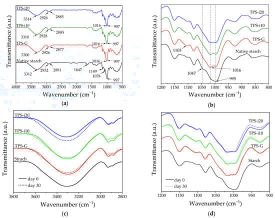 FTIR−ATR spectra of native starch and co−plasticized TPS films for day 0: (a) 4000–500 cm−1; (b) 1200–800 cm−1; and for days 0 and 30: (c) 3800–2800 cm−1; (d) 1200–900 cm−1.