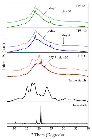 Figure 4 shows the XRD patterns of isosorbide and native starch and the different TPS films. The XRD spectrum of isosorbide was characterized by diffraction peaks mainly at 10.6, 19.1, and 20.8°, indicating the high crystallinity of this plasticizer [31]. In the spectrum of native starch, two peaks were observed at 15.3 and 23.2°. In addition, an undefined double peak at 17.3 and 18.1° corresponds to the presence of type C crystalline structures (a combination of type A and B crystals). These polymorphic structures are typical of starches from roots [50].