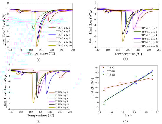 DSC thermograms and retrogradation kinetics of glycerol- and isosorbide-plasticized films: (a) glycerol-plasticized starch; (b) glycerol/isosorbide TPS-i10; (c) glycerol/isosorbide TPS-i20; (d) plots for ln[−ln(1 − DR)] versus Ln (t).