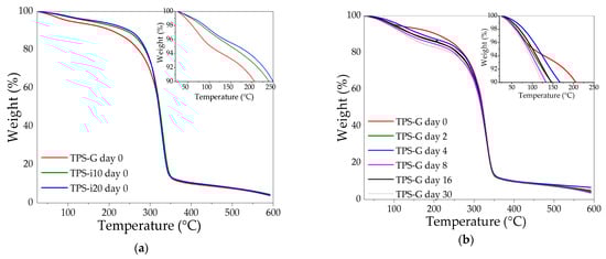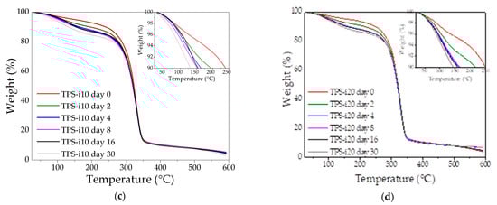 Thermogravimetric curves at day 0: (a) TPS films; and day 0–30: (b) TPS-G, (c) TPS-i10, (d) TPS-i20.
