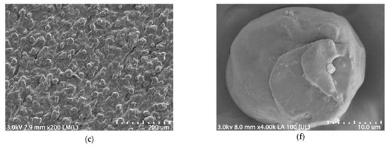 The plasticizer’s processing and presence destructured most of the starch granules. However, residual starch granule structures were observed outside the matrix (Figure 7b,d,f) and inside the matrix (Figure 7a,c,e). The residual granules result from insufficient mixing and shearing typical of single-screw extrusion [68]. This process still has room for improvement. The presence of starch granules could also indicate incomplete plasticization [69]. Starch granules that were not plasticized and remained outside the polymeric matrix were observed (Figure 7b,d,f). In them, small changes on their surface could suggest the damage caused by shearing in the extrusion and changes concerning the plasticization system employed. As the amount of isosorbide increased, the starch granules suffered more significant damage to their structure (Figure 7b,d,f); the increase in viscosity causes this and the high shear stresses when isosorbide is used [22,27,31].