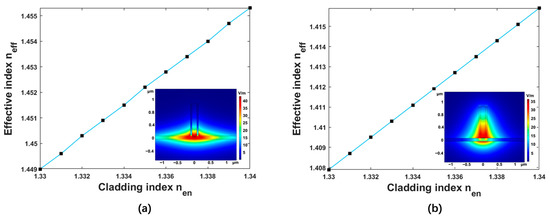 High sensitivity indicates that the waveguide detects the changing refractive index of the analyte more precisely. The polarization state of the optical wave directly affects the sensing sensitivity. Thus, to obtain high sensitivity, the appropriate selection of polarization state for optical wave operation is of great significance. The waveguide height, the slot width, and the total waveguide width were fixed as = 1 μm, = 150 nm and = 250 nm, respectively. The variations of the effective refractive index of the waveguide with the refractive index of the analyte in the transverse electric mode (TE) and transverse magnetic mode (TM) are shown in Figure 2. The sensitivities of the waveguide for the TE and TM polarizations were 343.02 nm/RIU and 435.58 nm/RIU, respectively. The optical power ratio Ƞ represents the cladding optical field energy divided by the total energy, which can reflect the intensity of the interaction between the optical field and analyte. The values of Ƞ for TE and TM polarization were 80.9% and 87.5%, respectively. Therefore, both the sensitivity and the Ƞ of the slot waveguide for the TM polarization were higher than that for the TE polarization. The distribution of the optical field showed that there was an optical field leakage in the slot waveguide for TE polarization, and the slot waveguide for TM polarization exhibited stronger confinement on the optical field. Therefore, the TM polarization was selected as the working polarization of the optical wave, and the following analyses were performed at the TM polarization. Additionally, the sensitivity and Ƞ of the suspended slot waveguide and slot waveguide on substrate for TM polarization were analyzed, respectively. The sensitivity of the slot waveguide on substrate for TM polarization was 320 nm/RIU, and the Ƞ was 57.6%. The sensitivity of the suspended slot waveguide was 1.36 times higher than that of slot waveguide on substrate, and the optical power ratio was 1.52 times higher than the non-suspended structure. The adoption of a suspended structure had a positive impact on sensitivity enhancement.