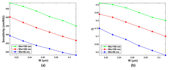 (a) Relationships between the sensing sensitivity and the wavelength at different slot widths. (b) Relationships between the Ƞ and the wavelength at different slot widths.